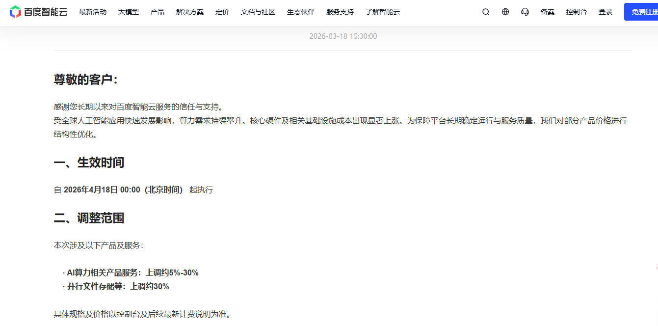 18日下午,百度智能云宣布,自2026年4月18日起,AI算力相关产品服务价格上调约5%-30%;并行文件存储等价格上调约30%。