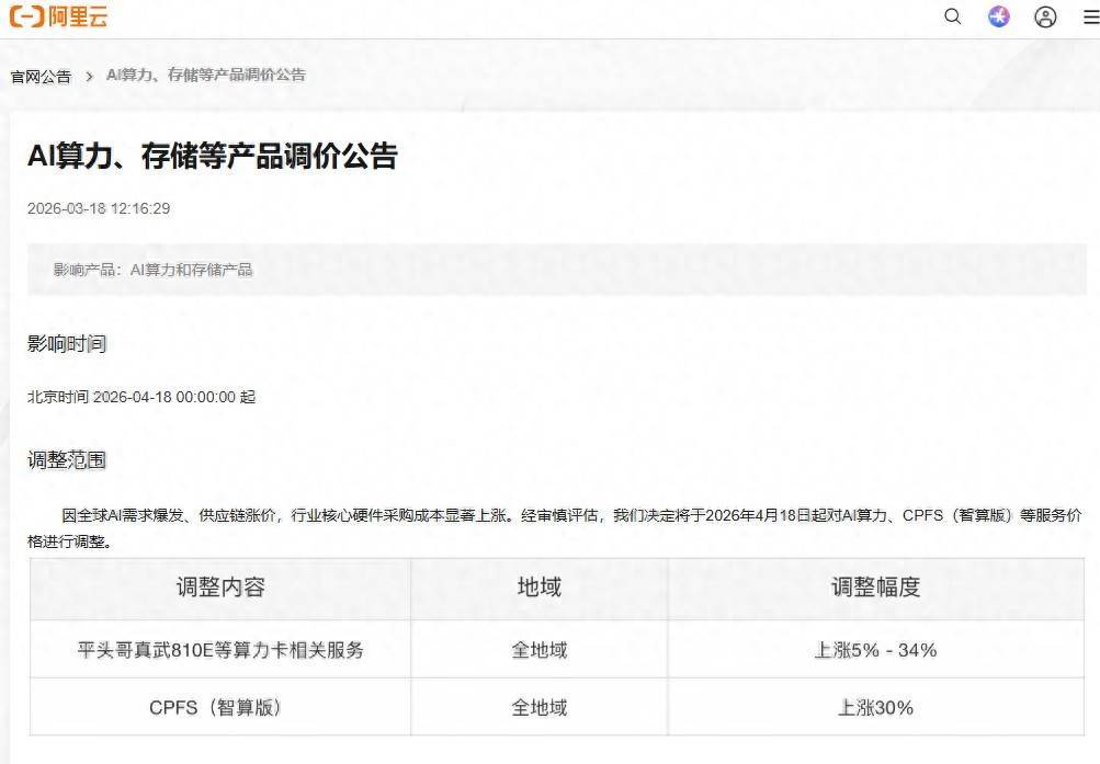 3月18日中午,阿里云官网宣布,将于2026年4月18日起对AI算力、CPFS(智算版)等服务价格进行调整。其中,平头哥真武810E等算力卡相关服务价格上涨5%-34%,CPFS(智算版)价格上涨30%。